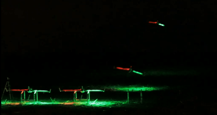The Chinese get more drones in the air because rather than having sophisticated chain-driven launchers like ARSENL (top GIF), their drones take off with what are essentially giant rubber bands (at around 40 seconds in). The number of launchers and the time it takes to reload was one of the limits on the U.S. exercise. It's also one of the reasons why the record for multi-copter swarming drones, which take off vertically without launchers, is much higher – Intel staged a 500-drone lightshow earlier this year.